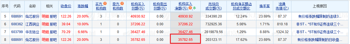 龙虎榜数据显示,作为有价格涨跌幅限制的日收盘价格涨幅达到15%的前五只证券,灿芯股份买入金额最大的前五名中,有3家机构专用席位。经统计,灿芯股份的机构席位今日净买入金额为35782.65万元。