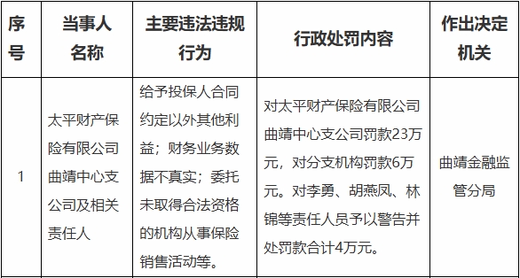 曲靖金融监管分局依据相关法律法规,对太平财产保险有限公司曲靖中心支公司罚款23万元,对分支机构罚款6万元;对李勇、胡燕凤、林锦等责任人员予以警告并处罚款合计4万元。