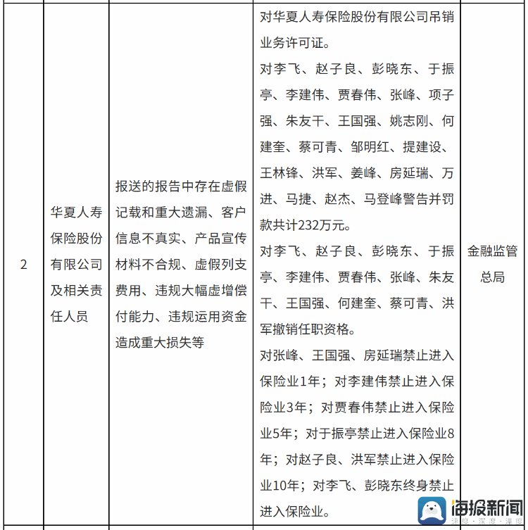 日前,国家金融监督管理总局一纸罚单震动了保险业:华夏人寿保险股份有限公司因多项严重违法违规行为,被吊销业务许可证,原董事长李飞、董事会秘书彭晓东被终身禁止进入保险业,包括原总经理赵子良在内的23名责任人受到警告、罚款、撤销任职资格及1年至10年不等的禁业处罚。